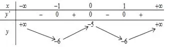 Lời giải: Dựa vào bảng biến thiên, ta thấy $\lim_{x \to \pm\infty} y = +\infty$, suy ra đây là hàm số bậc bốn trùng phương có hệ số $a > 0$, do đó loại đáp án B. Hàm số có 3 điểm cực trị là $x=0, x=\pm 1$. Xét đáp án A: $y = {x^4} - 2{x^2} - 5$, ta có $y' = 4{x^3} - 4x = 4x({x^2} - 1)$, $y'=0 \Leftrightarrow x=0$ hoặc $x=\pm 1$. Các giá trị cực trị $y(0)=-5$ và $y(\pm 1)=-6$ đều khớp với bảng biến thiên, do đó A là đáp án đúng.